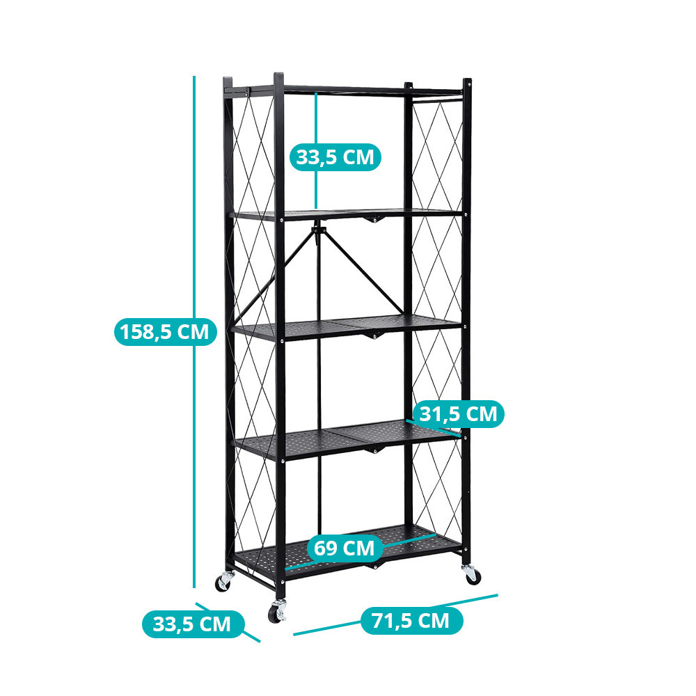 Fabricat dintr-o combinație de aluminiu și oțel, rack-ul este robust, dar ușor. Cele cinci rafturi permit organizarea eficientă a ustensilelor mari din bucătărie sau a obiectelor casnice.