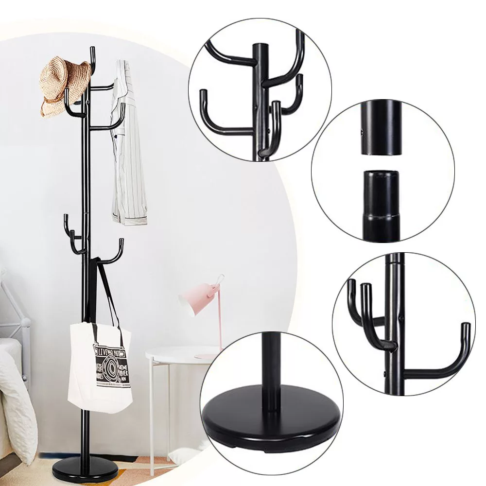 Aceast suport de haine oferă o soluție practică pentru depozitarea paltoanelor, genților, pălăriilor și altor accesorii. Cu culoarea sa neagră elegantă și forma modernă, se integrează perfect în orice spațiu interior – fie că este vorba de un hol, dormitor sau birou.