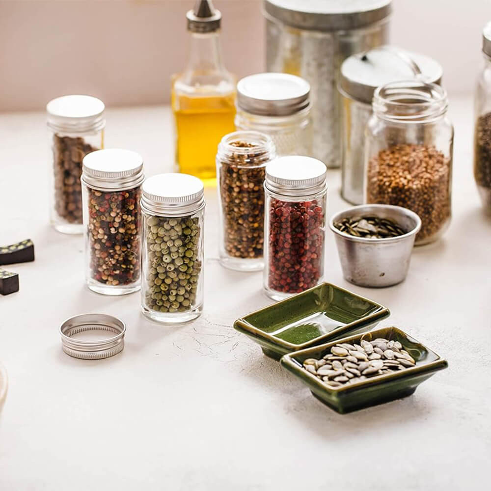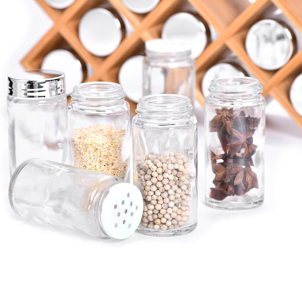 Pachetul conține 18 borcane cu dozator, astfel fiecare condiment are locul său. Borcanele compacte sunt ușor de umplut și etichetat cu autocolantele inscripționabile incluse.