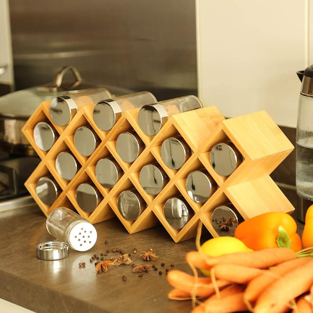- 1 suport din bambus cu 18 borcane pentru condimente