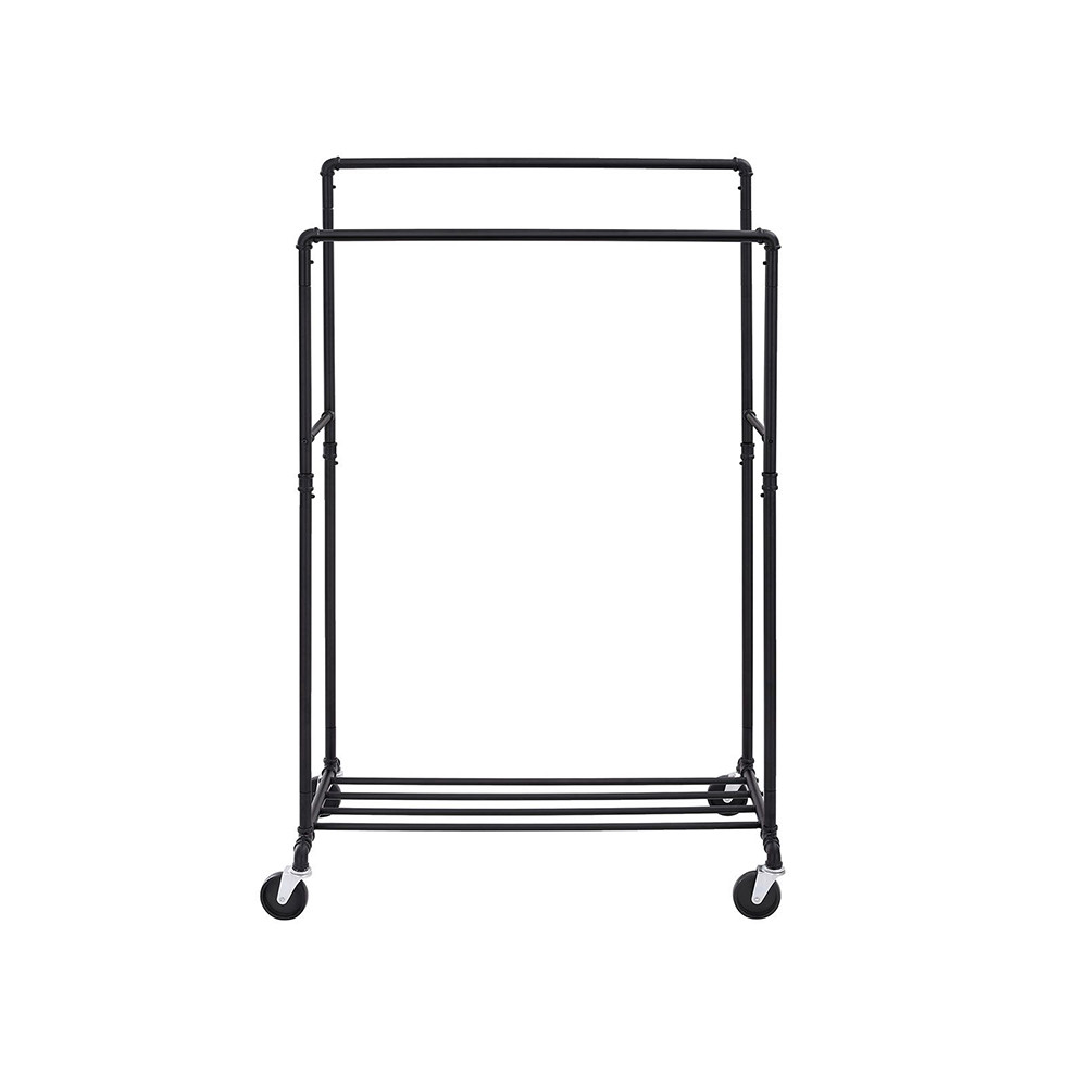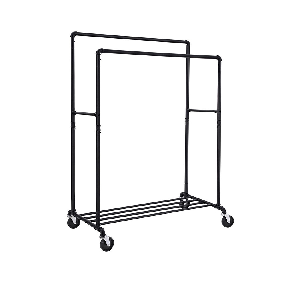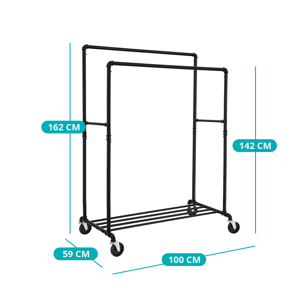 Acest suport de haine dublu pe roți aduce un aer modern industrial în dormitor, magazin sau studio. Este o soluție elegantă și practică pentru organizarea hainelor și accesoriilor.