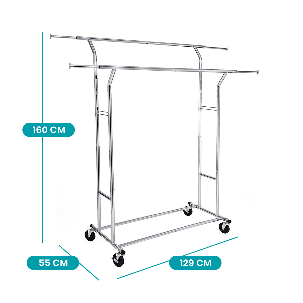 Bara superioară poate fi extinsă între 129 și 169 cm, iar înălțimea se poate ajusta între 148 și 172 cm. Perfect pentru organizarea hainelor de diferite dimensiuni – de la paltoane la rochii lungi.