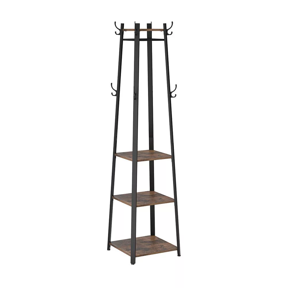 Forma ușor conică nu doar că arată interesant din punct de vedere vizual, dar face și suportul mai stabil. Cadru din oțel negru mat oferă suport fiabil, în timp ce cele 3 rafturi oferă diverse opțiuni de depozitare pentru coșuri, pantofi sau decorațiuni.