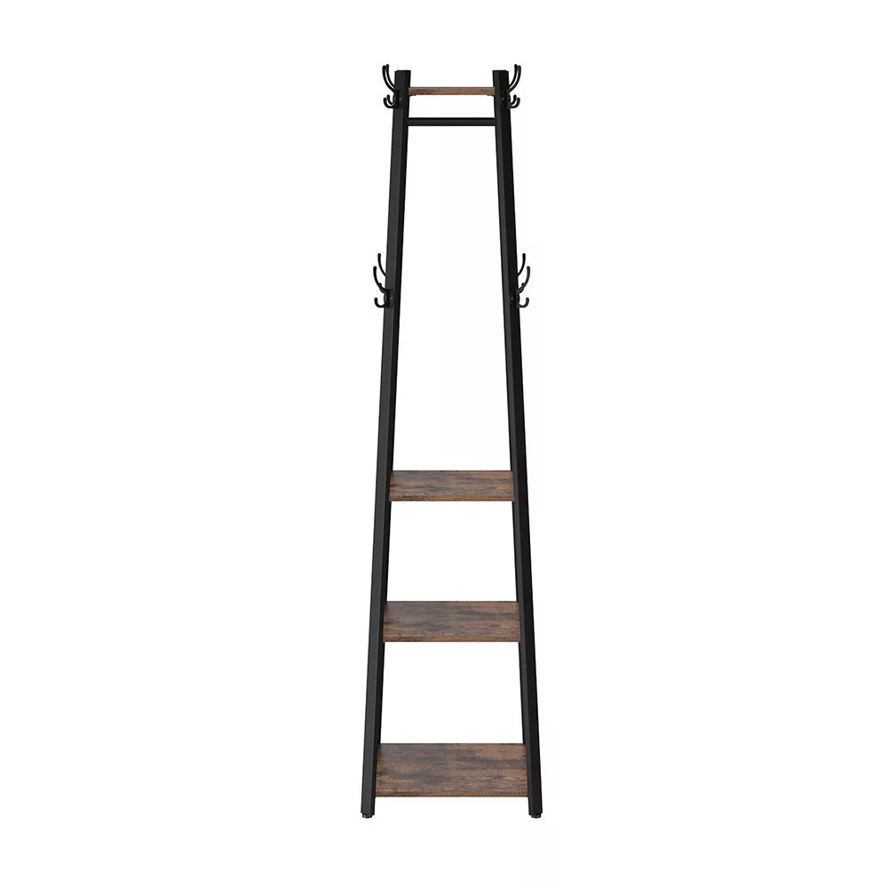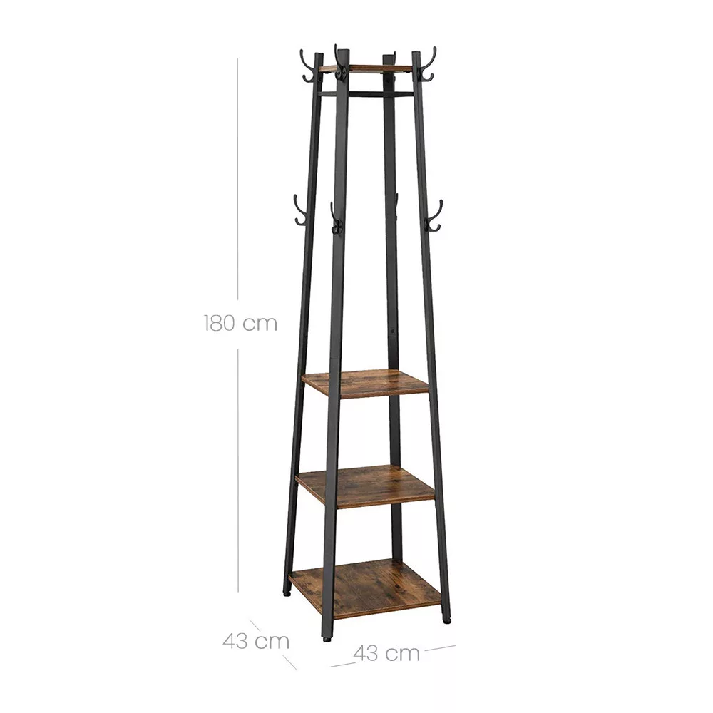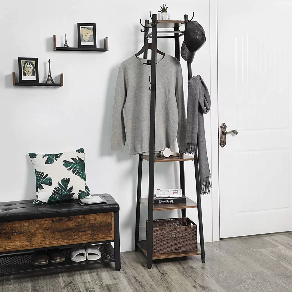 Combinația dintre un cadru din oțel cu stil industrial și rafturi rustice creează o atmosferă modernă, dar confortabilă. Suportul nu este doar o soluție utilă de depozitare, ci și o piesă distinctivă de decor pentru casă care îmbunătățește instantaneu holul sau un colț al camerei de zi.