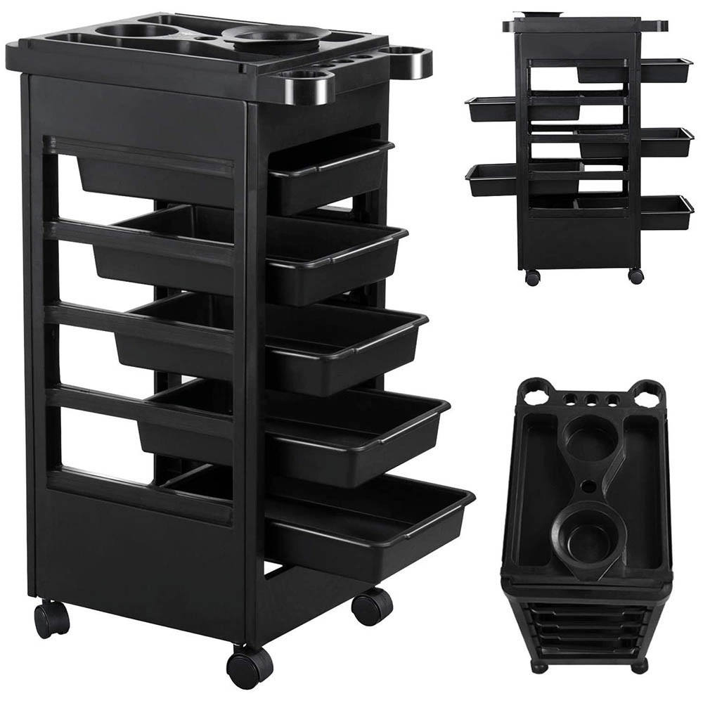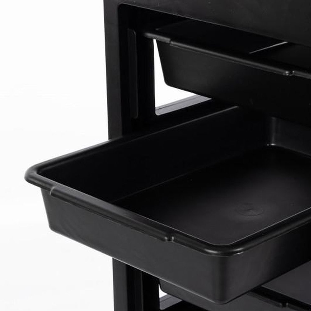 Trolerul de coafor este echipat cu 5 sertare glisante, oferind spațiu optim pentru depozitarea uneltelor și accesoriilor necesare. Dimensiunile tăvilor (38x27 cm) sunt ideale pentru foarfece, piepteni, vopsele și alte ustensile, astfel încât totul să fie mereu la îndemână.